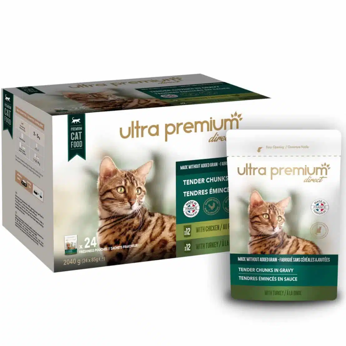 Nos sachets fraîcheur sous forme d’émincés en sauce au poulet et à la dinde sont fabriqués sans céréales en accord avec la nature de votre chat. Cette recette convient à tous les chats, stérilisés ou non, et sera idéale pour varier les menus de votre petit félin. Nos émincés en sauce au poulet et à la dinde se présentent sous la forme de sachets fraîcheur pour chat et sont élaborés à partir d’ingrédients de haute qualité. De formulation vétérinaire, sans colorants, sans arômes et sans conservateurs artificiels, cette pâtée pour chat est fabriquée sans céréales afin de respecter le régime naturel de nos chats qui sont des carnivores stricts. Ces sachets fraîcheur sont formulés pour répondre aux besoins des chats adultes stérilisés et contribueront à maintenir le poids de forme de votre félin. Ils conviendront aussi à des chats actifs vivant à l’extérieur. L’apport en fibres, taurine et oméga 3 …